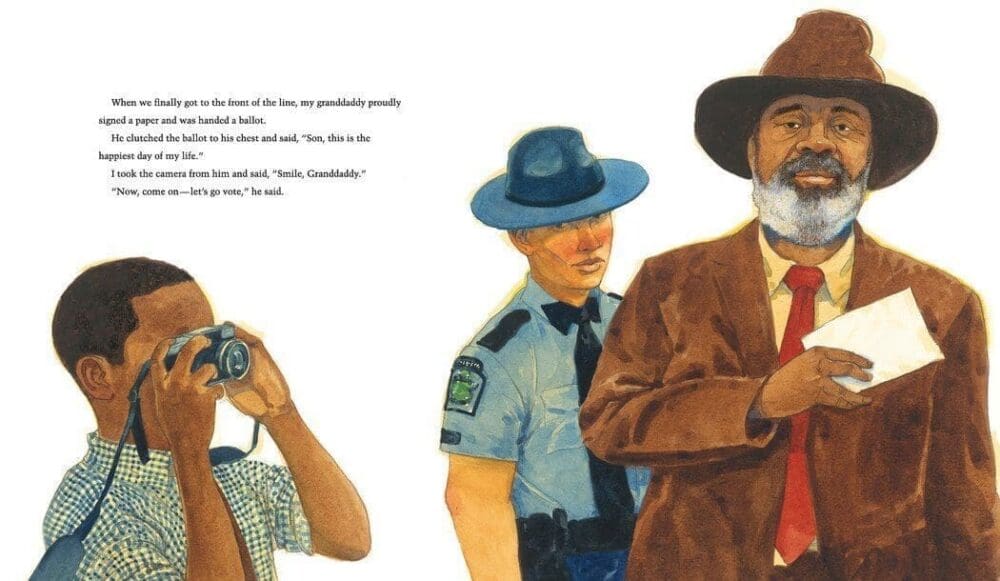 Life on the farm with Granddaddy is full of hard work, but despite all the chores, Granddaddy always makes time for play, especially fishing trips. Even when there isn’t a bite to catch, he reminds young Michael that it takes patience to get what’s coming to you. One morning, when Granddaddy heads into town in his fancy suit, Michael knows that something very special must be happening?—?and sure enough, everyone is lined up at the town hall! For the very first time, Granddaddy is allowed to vote, and he couldn’t be more proud. But can Michael be patient when it seems that justice just can’t come soon enough? This powerful and touching true-life story shares one boy’s perspective of growing up in the segregated South, while beautiful illustrations depict the rural setting in tender detail. (32 pgs) Ages 6-9