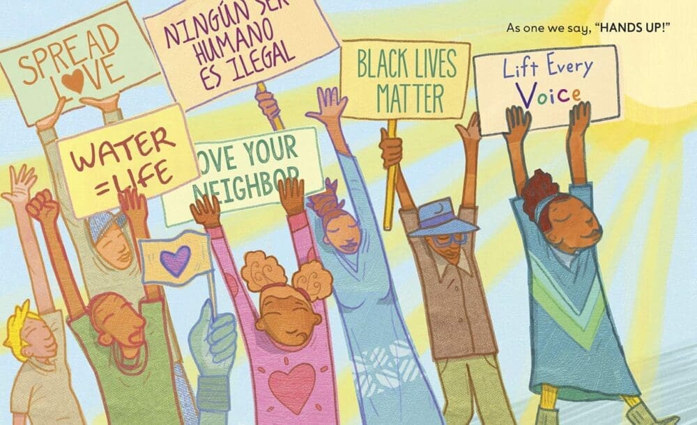 This triumphant picture book recasts a charged phrase as part of a black girl’s everyday life–hands up for a hug, hands up in class, hands up for a high five–before culminating in a moment of resistance at a protest march.